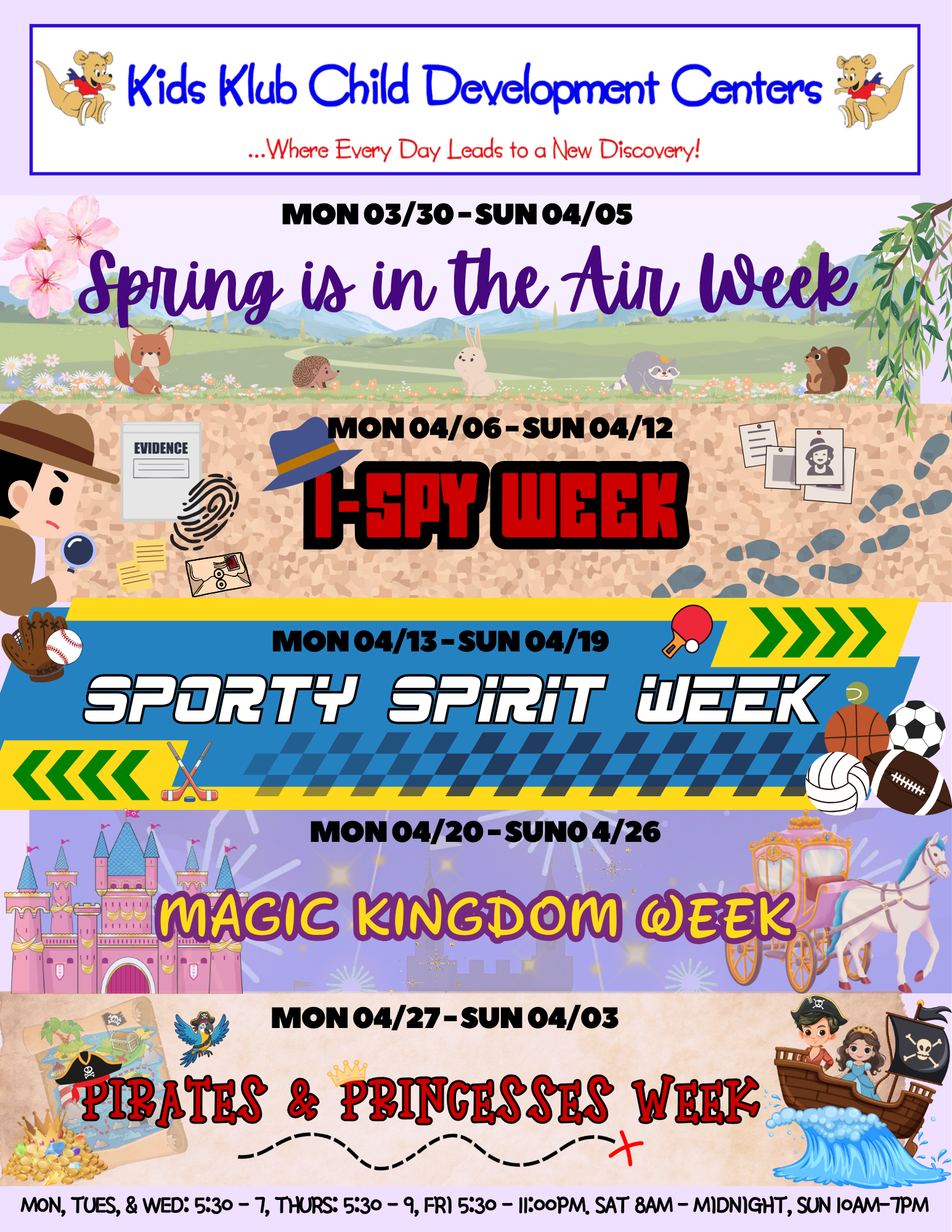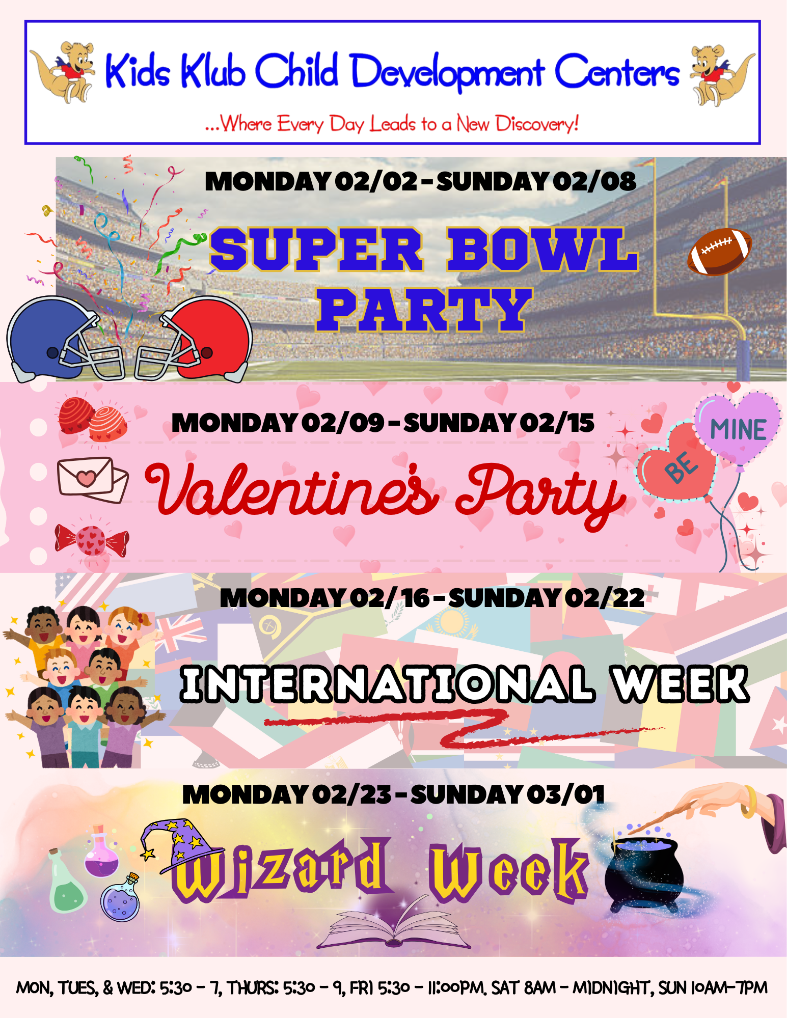Most Kids Klub Child Development Centers offer extended hours, with daycare centers open on weekends and evenings. We are here to care for your children during the hours when other childcare facilities are closed. Our safe and secure facility will leave you with the peace of mind of knowing that your children are in loving hands and having a great time while you work, run errands, or enjoy a well-deserved parents’ night out. Our experienced, enthusiastic, thoroughly-trained, and college-educated teachers are masters at bonding with children quickly and assisting children in making new friends. The result: children feel comfortable and safe—allowing them to have the time of their lives—whether it is their first time attending or not. Your child will enjoy activities in our many hands-on discovery centers (e.g. dressing up in our theater, doing a cooking project in “Kitchen Creation”, meeting a bearded dragon in our science area, playing a game of basketball, making a masterpiece in the art center, or jumping on one of our many bounce houses, etc.) Our schedule is comprised of weekly and monthly themes that are integrated with activities in these centers. From Valentine’s Day to New Year’s Eve celebrations, there are even events with special “guests” to make your child’s experience even more unforgettable!